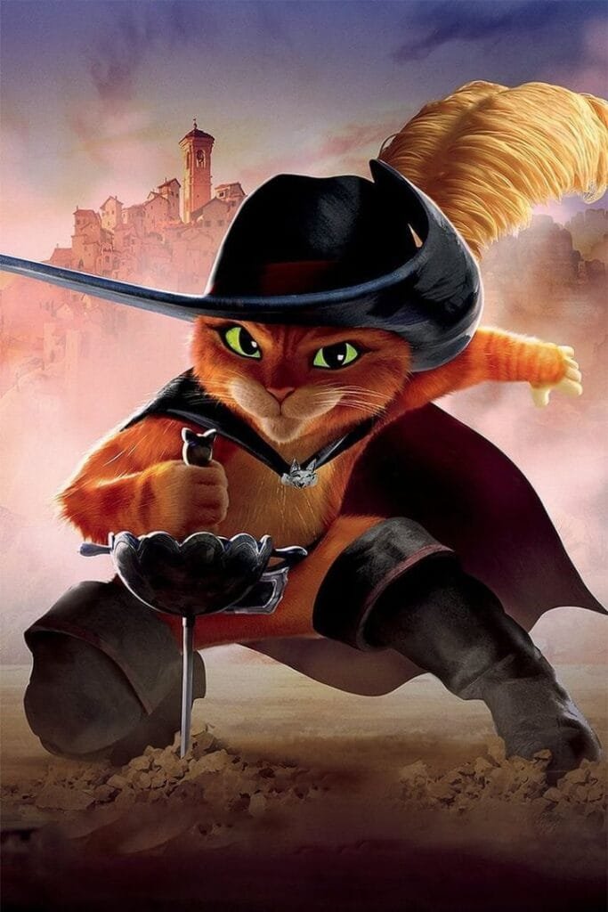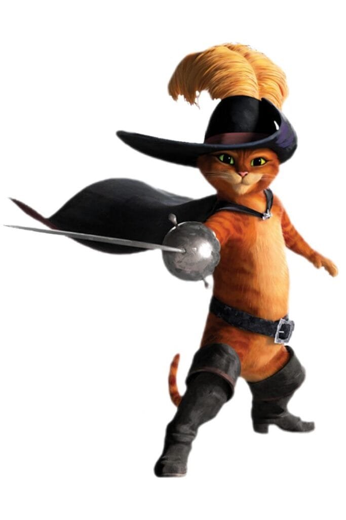 Puss in Boots is a character from the Shrek series and his own spin-off films, known for his charming personality, sword-fighting skills, and signature big-eyed plea.